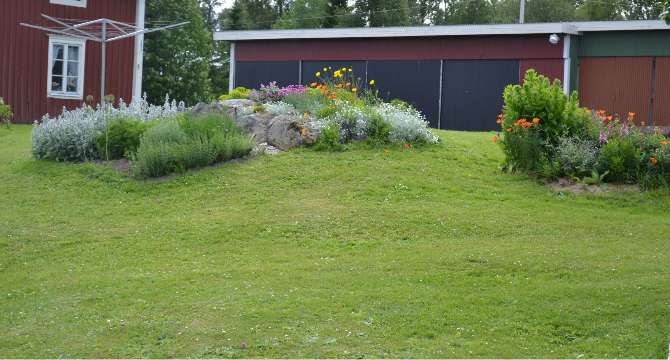 Storrams. Röd Snokört. Skuggnäva. Vita Syrenbuskar. Klippstånds, vilka även är mycket fina att plantera som häck.